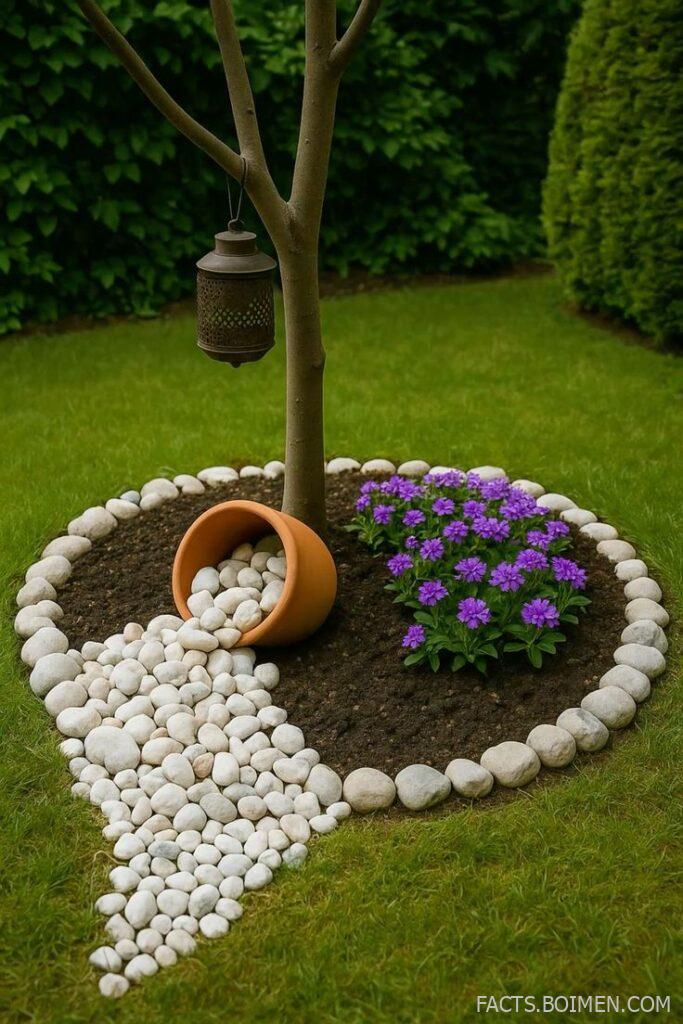 One of the most genius landscaping trends is the spill pot garden idea—where a terracotta pot is tipped on its side, spilling out stones, flowers, or a mix of both around the tree base. It transforms a dull circle of soil into a Pinterest-worthy focal point.