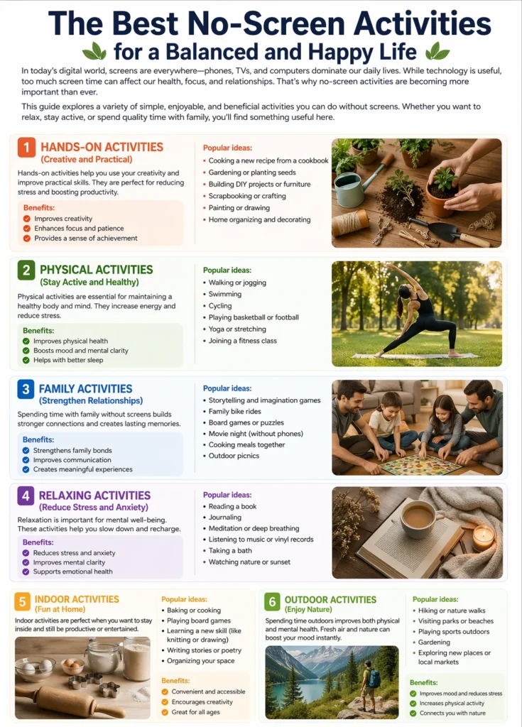 This guide explores a variety of simple, enjoyable, and beneficial activities you can do without screens. Whether you want to relax, stay active, or spend quality time with family, you’ll find something useful here.